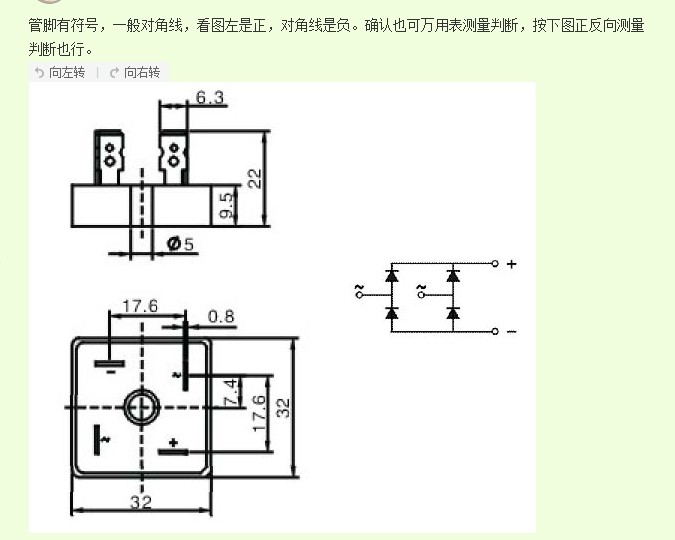 检测方式:单相桥式整流堆是由4只整流二极管按全波整流电路连接方式封装在一起的整流组合件;